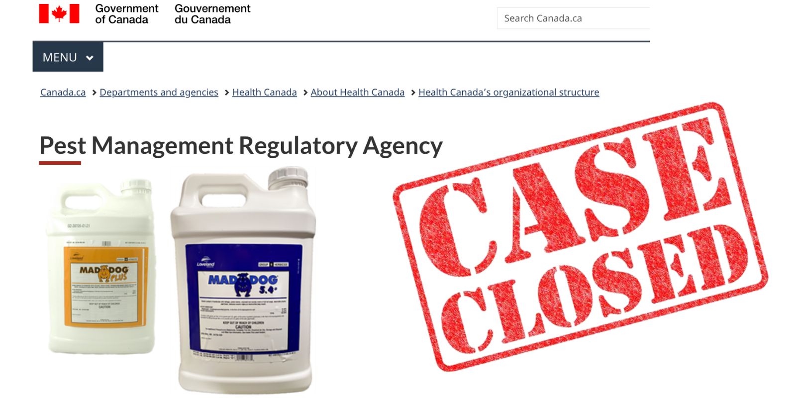 This fight is about the product “Mad Dog Plus”, and the fact that the Pest Management Regulatory Agency (PMRA) routinely renews products, on a 5 year basis, without looking into new science on risks arising after major registration decisions.